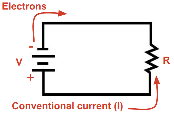 - Current \(I\) is the flow of electric charge, measured in amperes (A) or "amps".