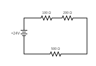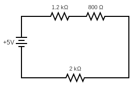 Imagine replacing all of the resistors in the circuit above with a single resistor with the same overall resistance. We call this equivalent resistance. For a series of resistors \(R_{1}\), \(R_{2}\), ..., \(R_{n}\), the equivalent resistance is the sum of all thre resistances: \[R = R_{1} + R_{2} + \dots + R_{n} \] For the circuit above we would get \(R = 1200 + 800 + 2000 = 4000 \Omega \)