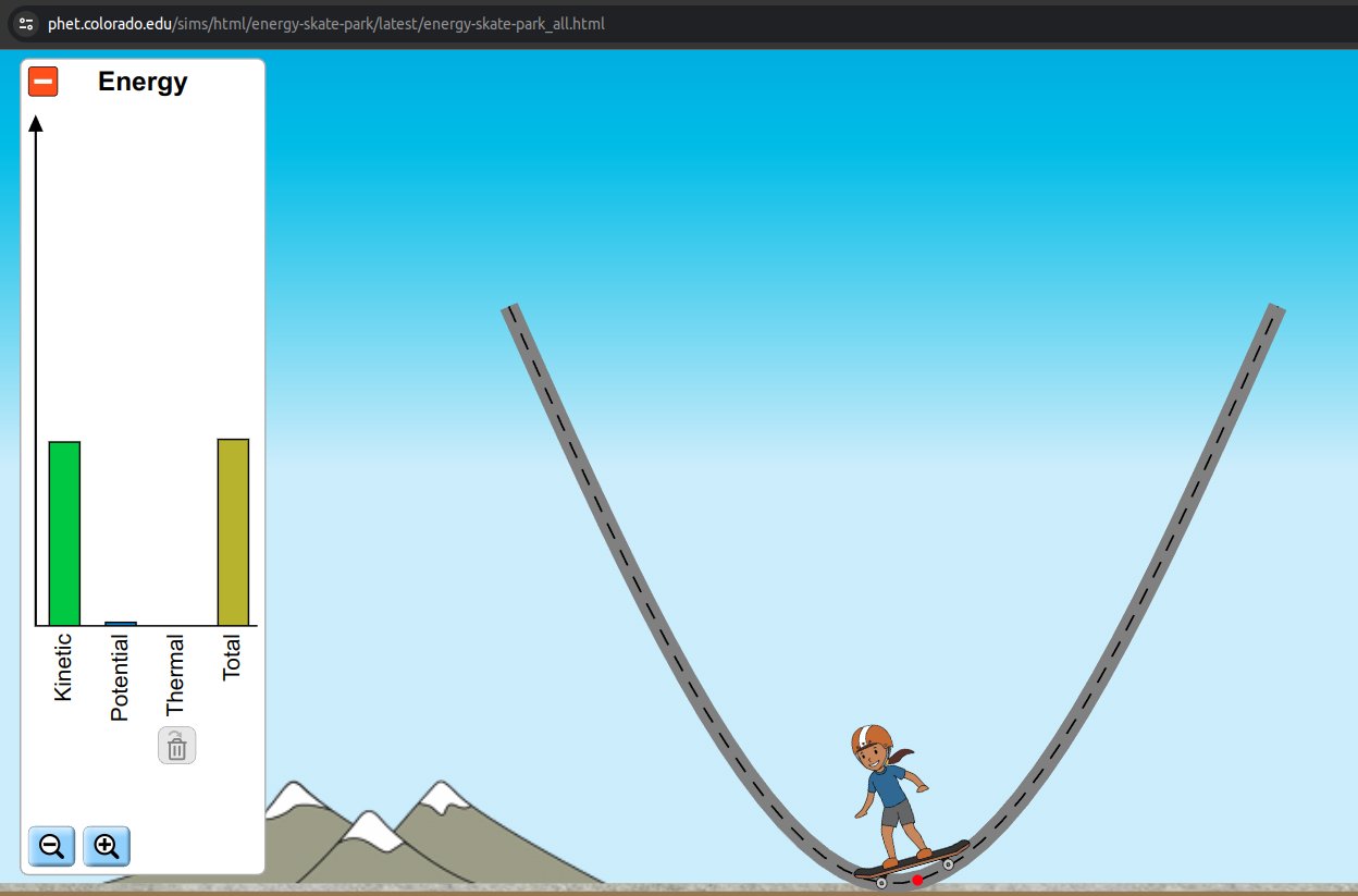Visit the PhET energy skate park. Let the skater loose on the track and click the green + to see the energy graph. Notice that the total energy remains constant, the potential energy is maximized when the skater is higher off the ground, and the kinetic energy is maximized when the skater is going fastest at the bottom of the ramp.